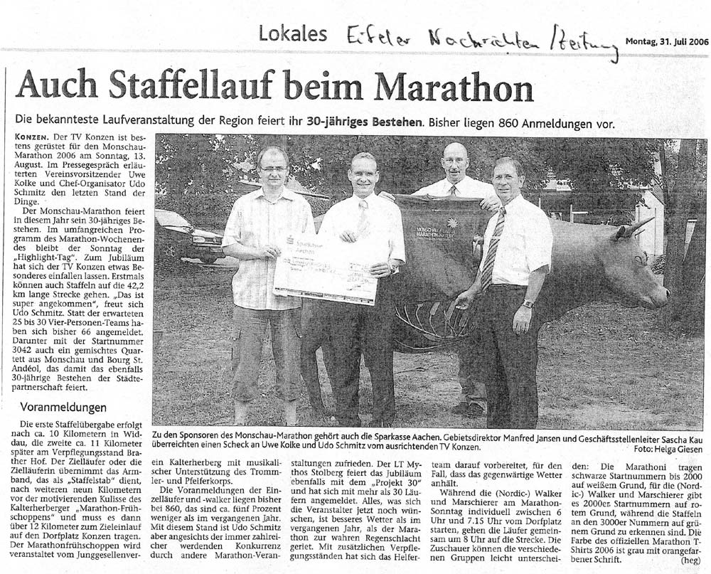 Eifeler Zeitung (09.08.2009)Das hat die Presse im Jahr 2006 über unseren Marathon verfasst. Hier gelangen Sie zu den Berichten.