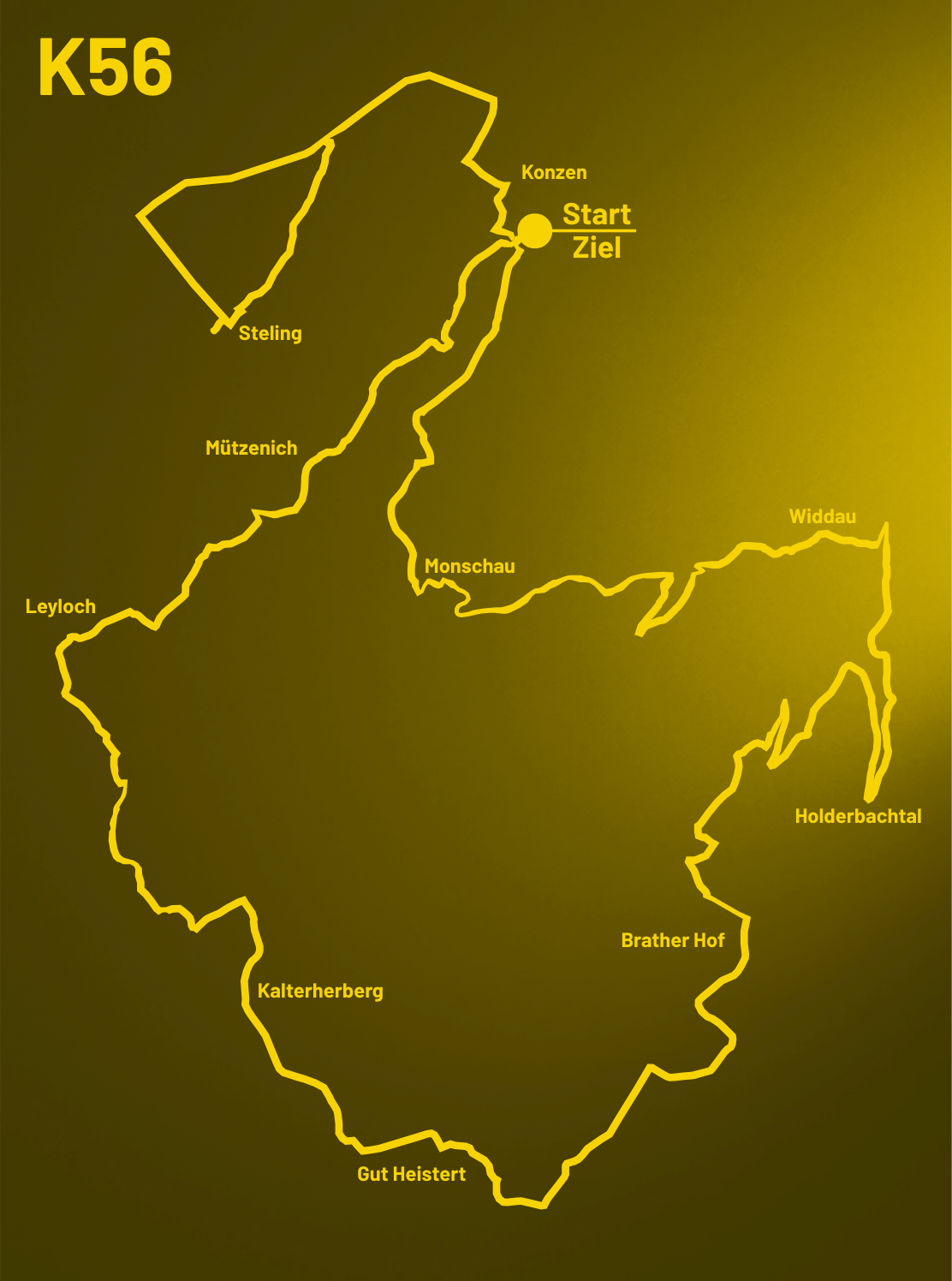 Der K56 Ultra Marathon führt über abwechslungsreiche Wege durch Wälder, Dörfer und über die Höhen rund um Monschau. Die Strecke ist mit 950 Höhenmetern herausfordernd, aber ideal für alle, die ihren ersten Ultra wagen oder nach einem schnellen, aber naturverbundenen Langstreckenlauf suchen.