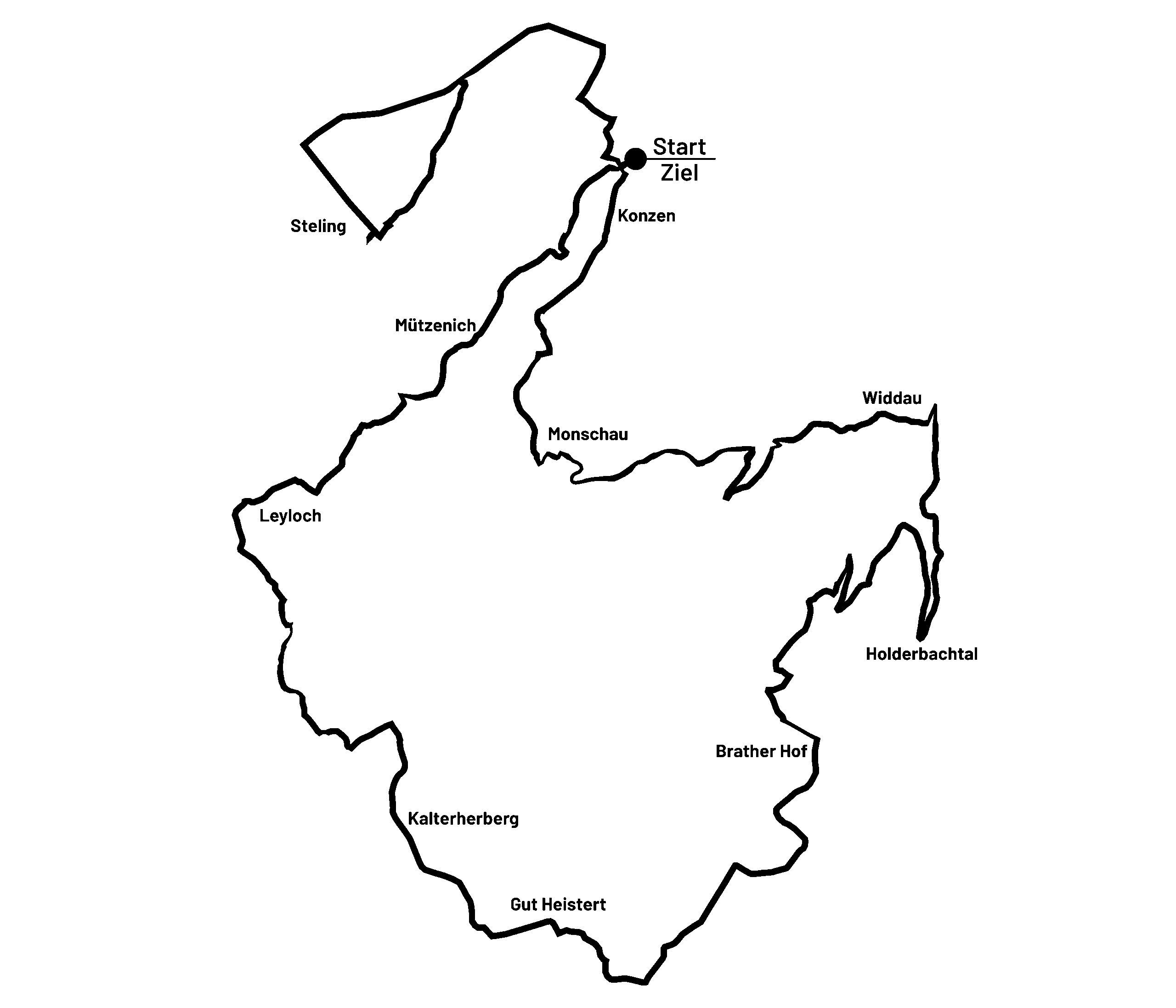Start an der Kirche in Konzen (544 m ü. NN). Rechts an der Kirche vorbei könnt ihr kurz Gas geben, denn dann geht´s erstmal hoch.