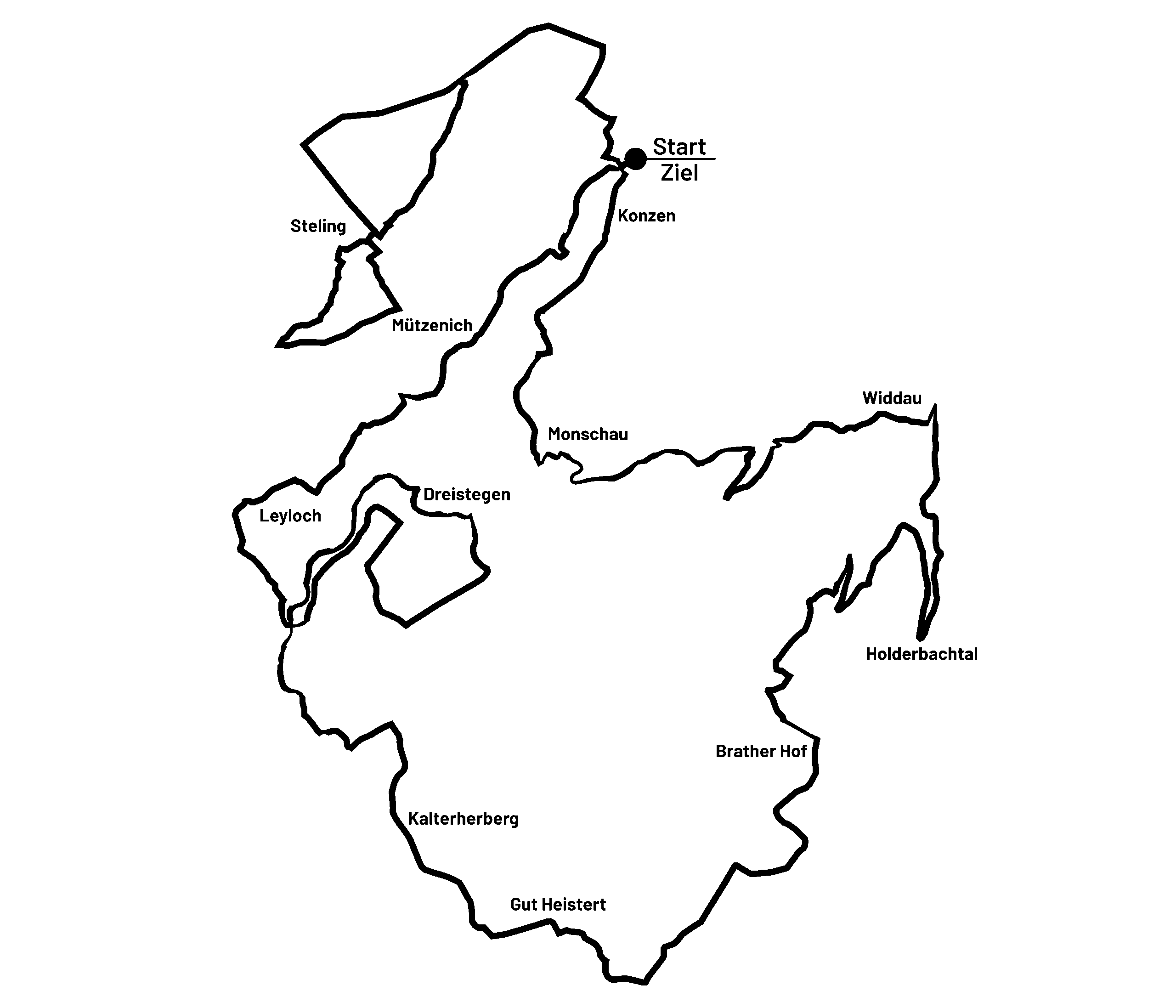 Start an der Kirche in Konzen (544 m ü. NN). Rechts an der Kirche vorbei könnt ihr kurz Gas geben, denn dann geht´s erstmal hoch.